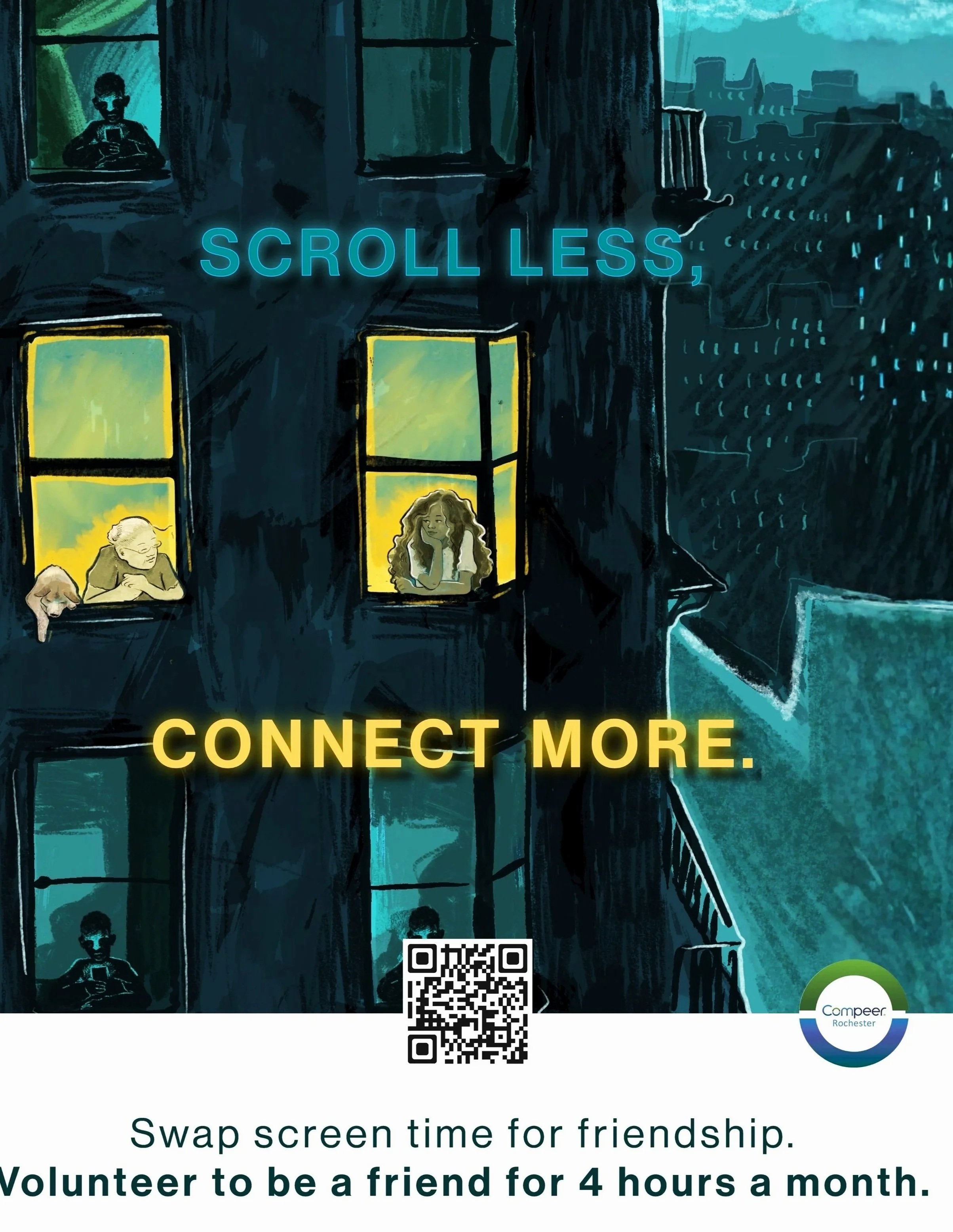 Scroll Less, Connect More. The average American spends about 64 hours a month on social media. Compeer Rochester’s volunteers swap just four of those hours, offering friendship to children, adults and Veterans who need a friend. This connection fosters wellness, reduces isolation, and strengthens our community.